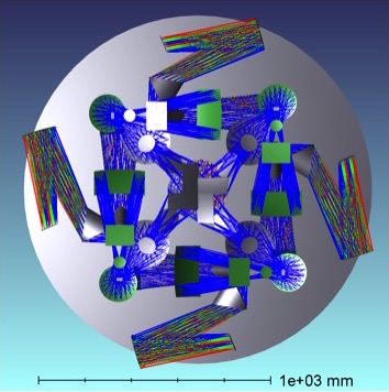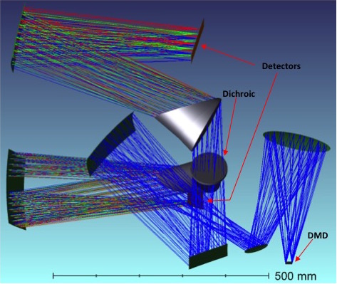 ATLAS has only one instrument, compact and modular; it fits below the primary mirror structure into a cylindrical envelope smaller than 1.5m in diameter. To achieve the large FoV, the telescope beam is diverted into 4 arms, each consisting of reimaging fore-optics, a DMD, and a dual-channel (blue/red) R=1000 spectrograph. A full view of the ATLAS Probe instrument is shown in the figure on the right. The 4-petal shape of the field allows for almost perfect tessellation of the sky. The instrument can be split into 4 identical and separable blocks, which simplifies the assembly, integration and testing.